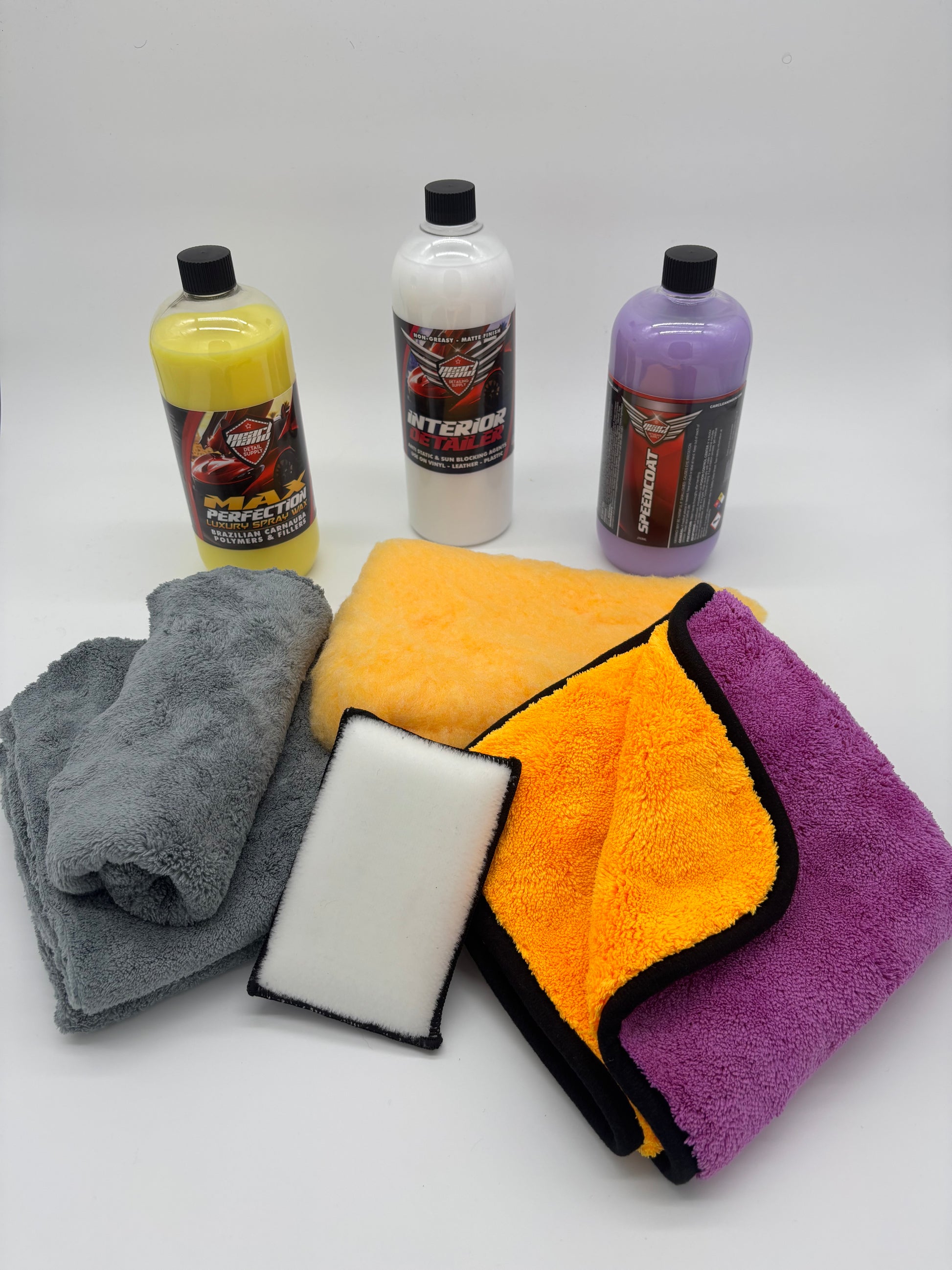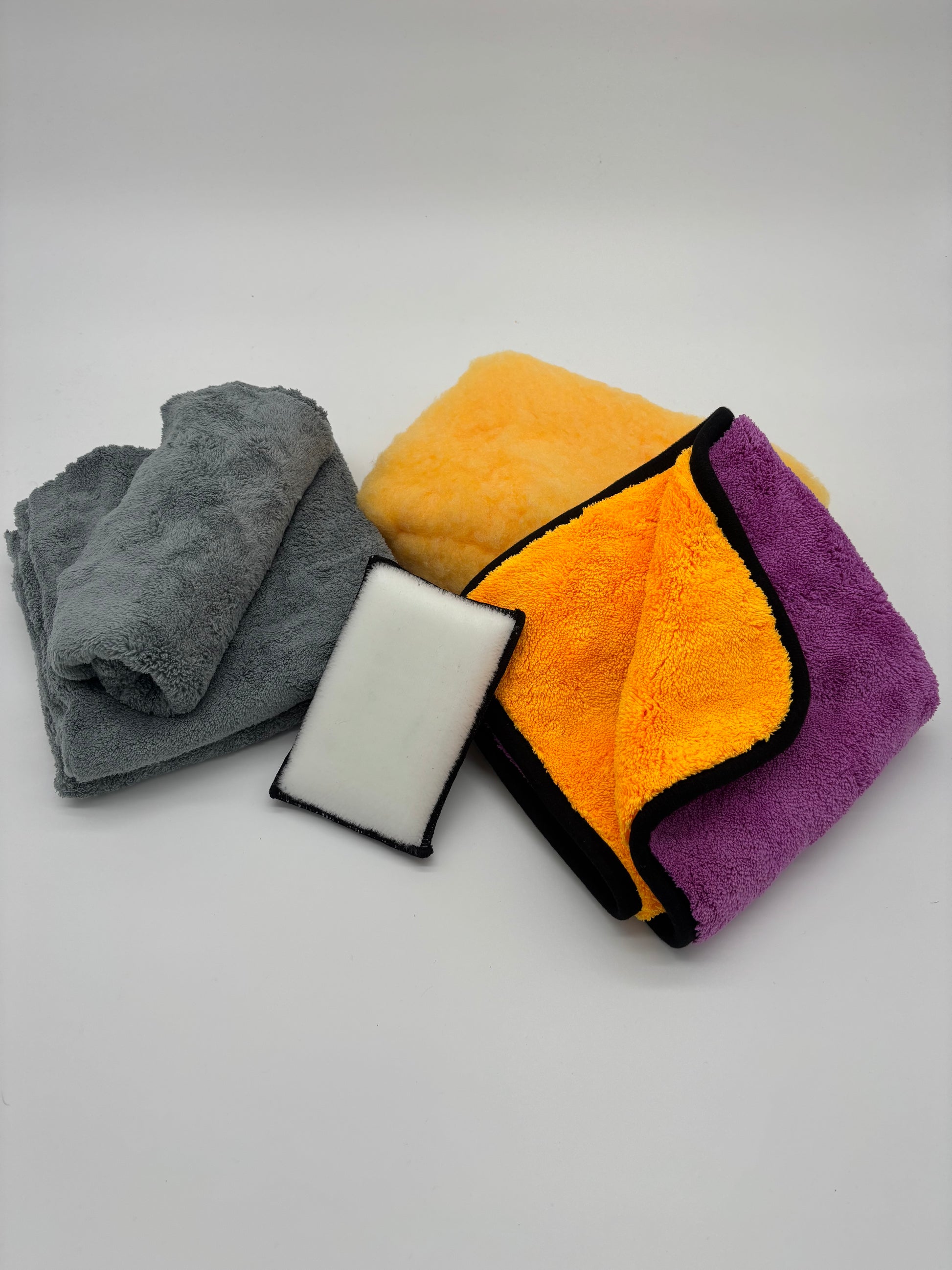 1x Interior Scrubbing Applicator Pad, 3x Edgeless Terry Towels, 1x Polyester Wash Mitt and 1x Pearl Nano 800gsm Microfibre Towel